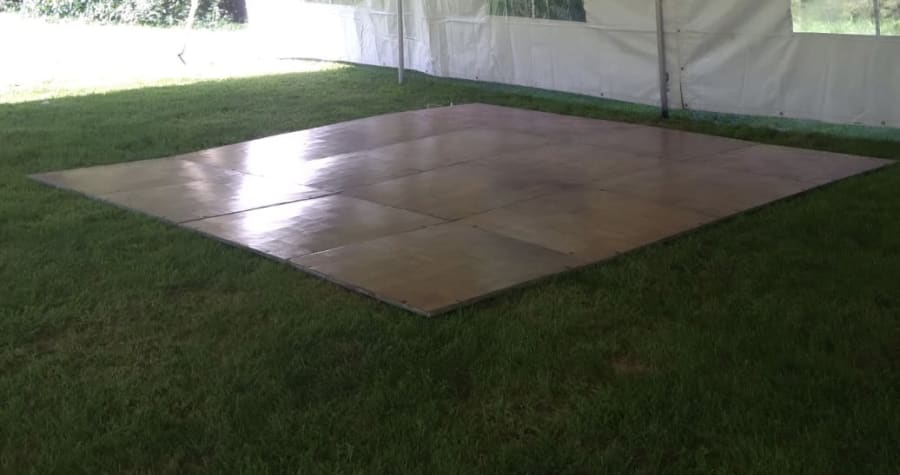 The 15'x15 Dance Floor typically can accommodate 25 guests and it consists of interlocking panels, which can be assembled and disassembled easily to create a customized size and shape that fits the event space. The panels are made of wood.
